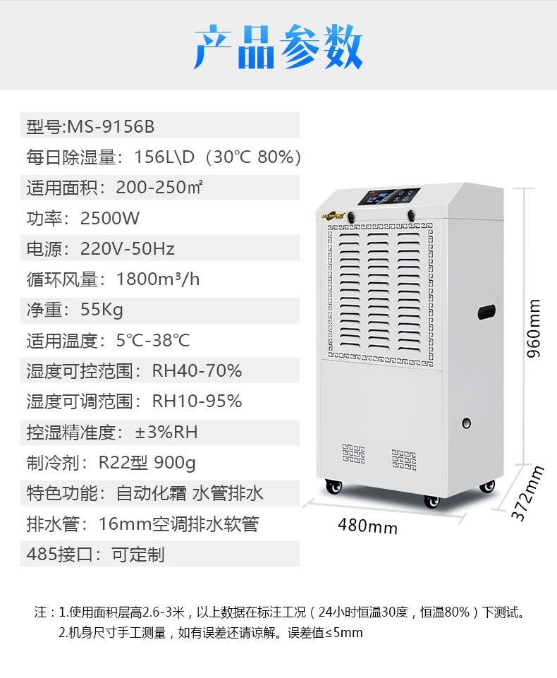 工业除湿机适用:100~250㎡大功率抽湿机地下室除湿器仓库MS-9156B
