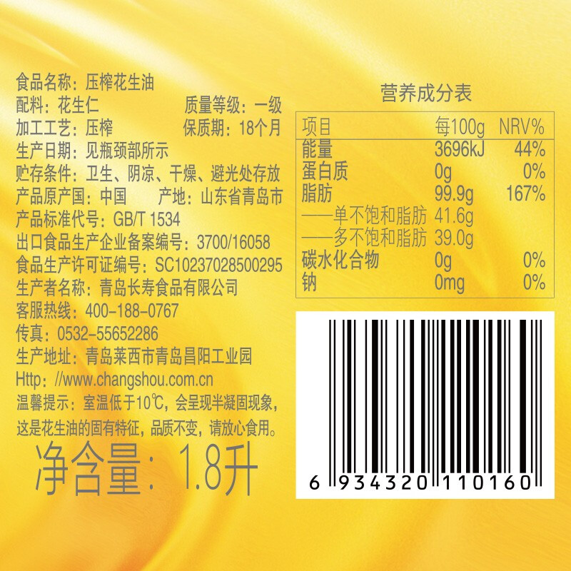 第一坊1.8L冷榨花生油一级物理压榨食用油小瓶 便携提手小瓶装山东特产 自营