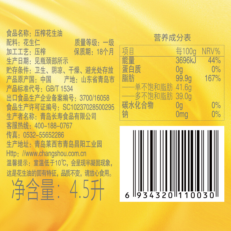 第一坊 冷榨花生油4.5L 食用油 冷榨工艺 至纯净低油烟 自营