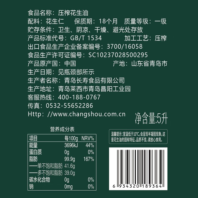 第一坊冷榨原香花生油5L食用油 大桶装 家庭装 粮油 送礼 【厂家直发】 自营